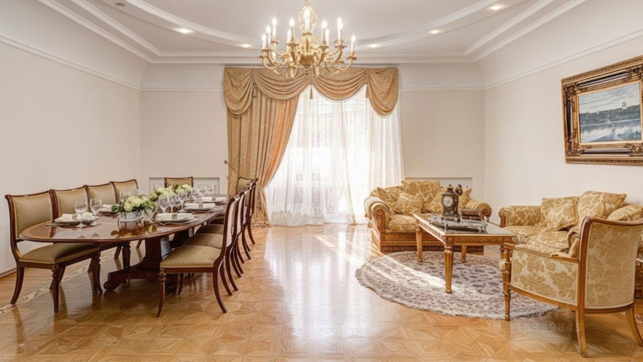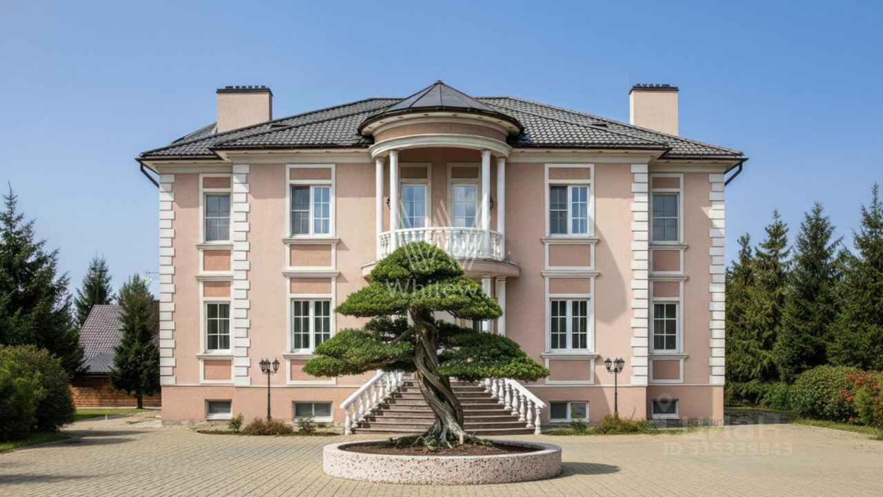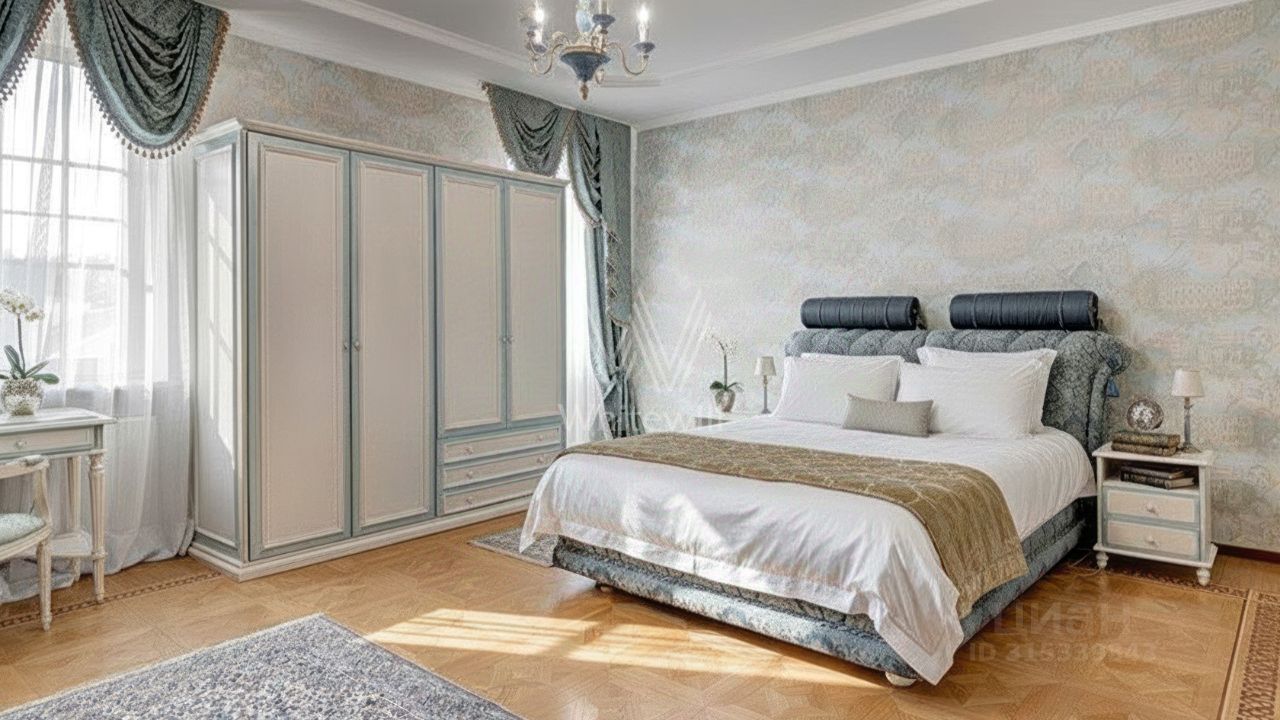 Усово-Престиж. Загородный коттедж площадью 850 м² расположен на полевом участке 45 соток. Фасад выполнен в классическом стиле, облицован штукатуркой и украшен изящными колоннами, рустовкой и балюстрадой, что придает ему элегантный вид. Интерьеры гармонично сочетаются с внешним обликом, они выдержаны в светлых тонах и дополнены комфортной мебелью, бытовой техникой и сантехникой.