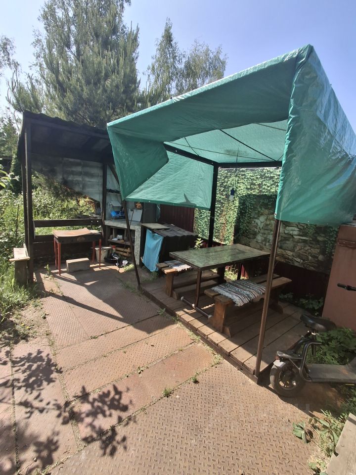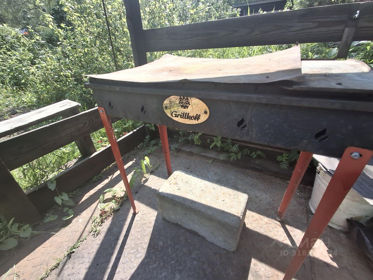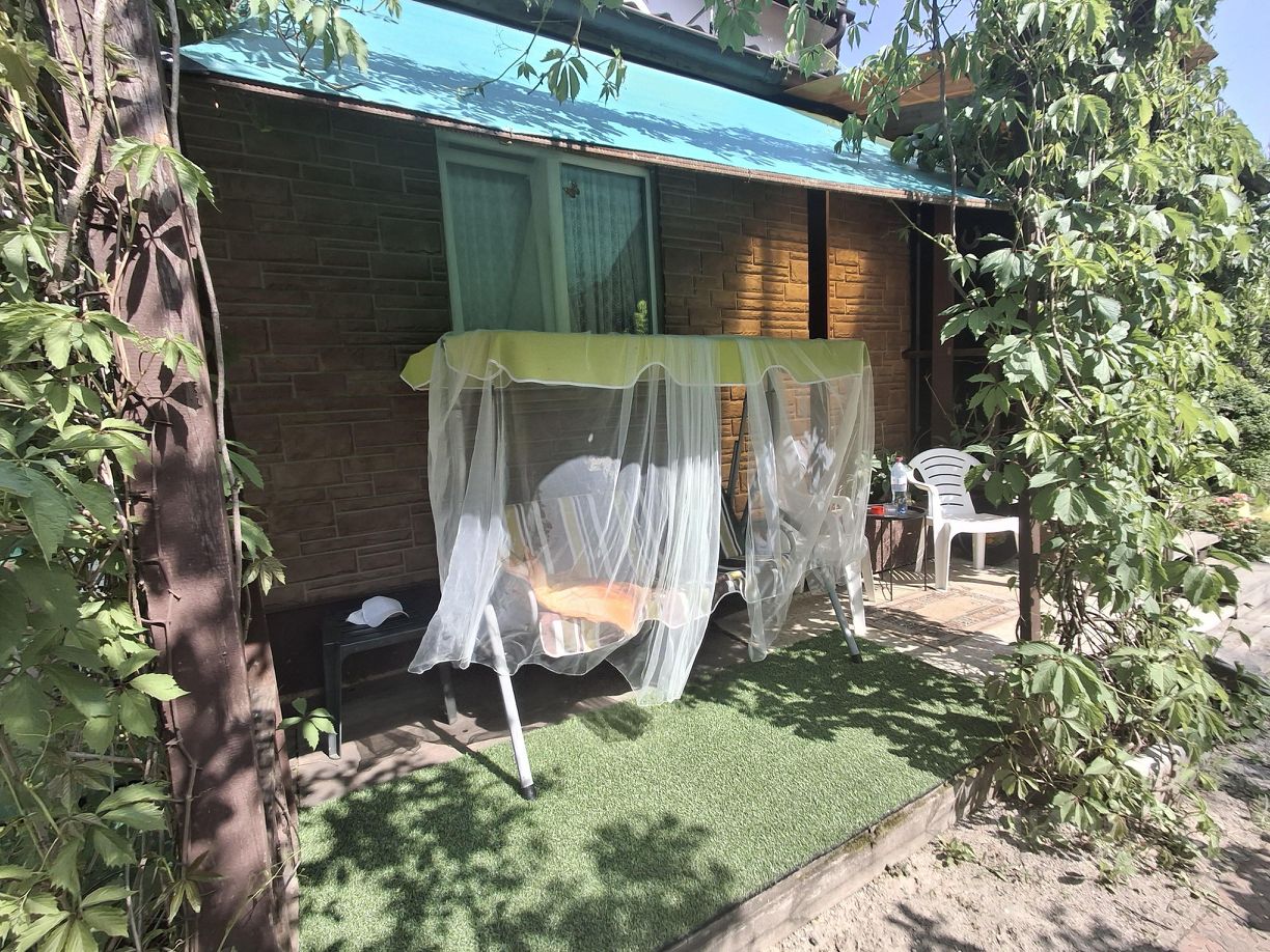 У крыльца мангальная зона и беседка для отдыха, отдельная закрытая терраса для дождливой погоды, большие садовые качели.