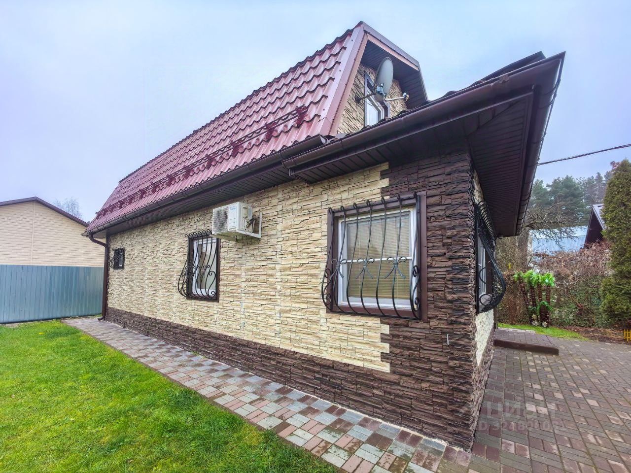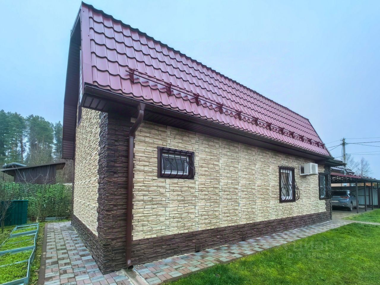 Каркасный. Снаружи обшит сайдингом с утеплителем Роквул (150 мм). Фундамент - ленточно-свайный (сваи по всему периметру и в середине фундамента). Крыша покрыта металлочерепицей с водостоками. Пластиковые окна (Рехау). На окнах кованые решетки с художественным орнаментом.
