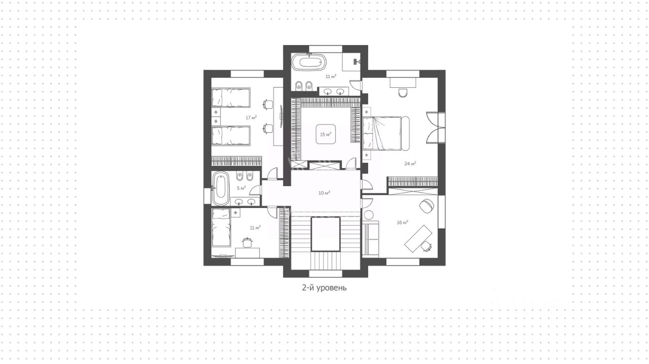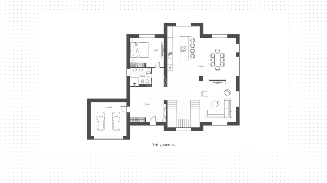 1 этаж: холл, гостевая спальня, гостевой санузел, кухня-столовая с выходом на террасу, гостиная. Выход в гараж. 2 этаж: мастер спальня с ванной комнатой и выходом на балкон. Гардеробная. Кабинет. Две детских спальни с ванной комнатой.