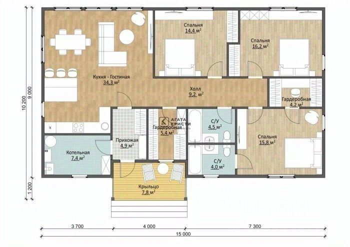Кухня-гостиная (34,3 м2) станет центром сбора гостей и семьи. В спальнях (14,4 м2, 15,8 м2 и 16,2 м2) можно установить мягкую мебель и шкафы для одежды. К одной из спален пристроена гардеробная площадью 4,2 м2.